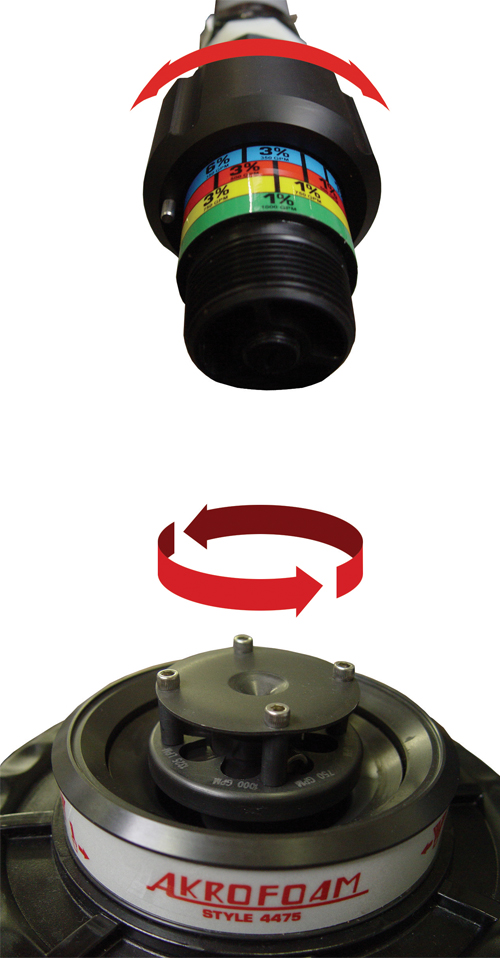 Akron 4475 Akrofoam is een zelfaanzuigende schuimnozzle met instelbare capaciteit. De schuimverhouding is bij de 4475 eenvoudig verstelbaar tussen 1%, 3%, 6% (6% alleen bij 1325 en 1900 lpm) middels een stelring. De bijgeleverde aanzuigbuis is 1 meter lang en de zuigslang 3 meter.